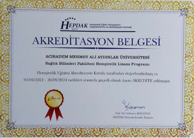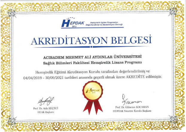 Bölümümüz akreditasyon çalışma gruplarının organizasyonu da bu standartlar esas alınarak oluşturulmuştur. Hazırlanan ÖDR, 02.07.2018 tarihinde Hemşirelik Eğitim Programları Değerlendirme ve Akreditasyon Derneği’ne (HEPDAK) yazılı olarak sunulmuştur. HEPDAK üyeleri tarafından 16–19 Aralık 2018 tarihlerinde kurum ziyareti gerçekleştirilmiş ve 24 Nisan 2019 tarihinde HEAK’ın 04.04.2019 tarihli toplantısında alınan karar doğrultusunda Hemşirelik Lisans Programı, ara ziyaret kararıyla iki yıl süreyle (30 Eylül 2021’e kadar) akredite edilmiştir.