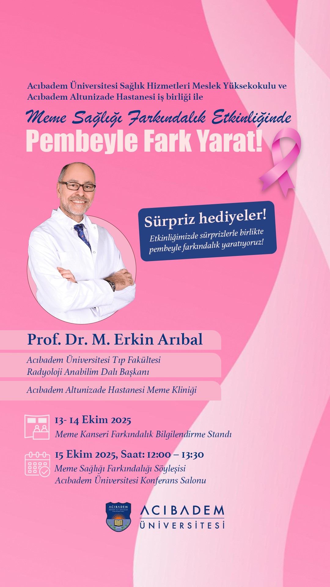 📅 15 Ekim 2025, Saat: 12:00 – 13:30 Meme Sağlığı Farkındalığı Söyleşisi Acıbadem Üniversitesi Konferans Salonu