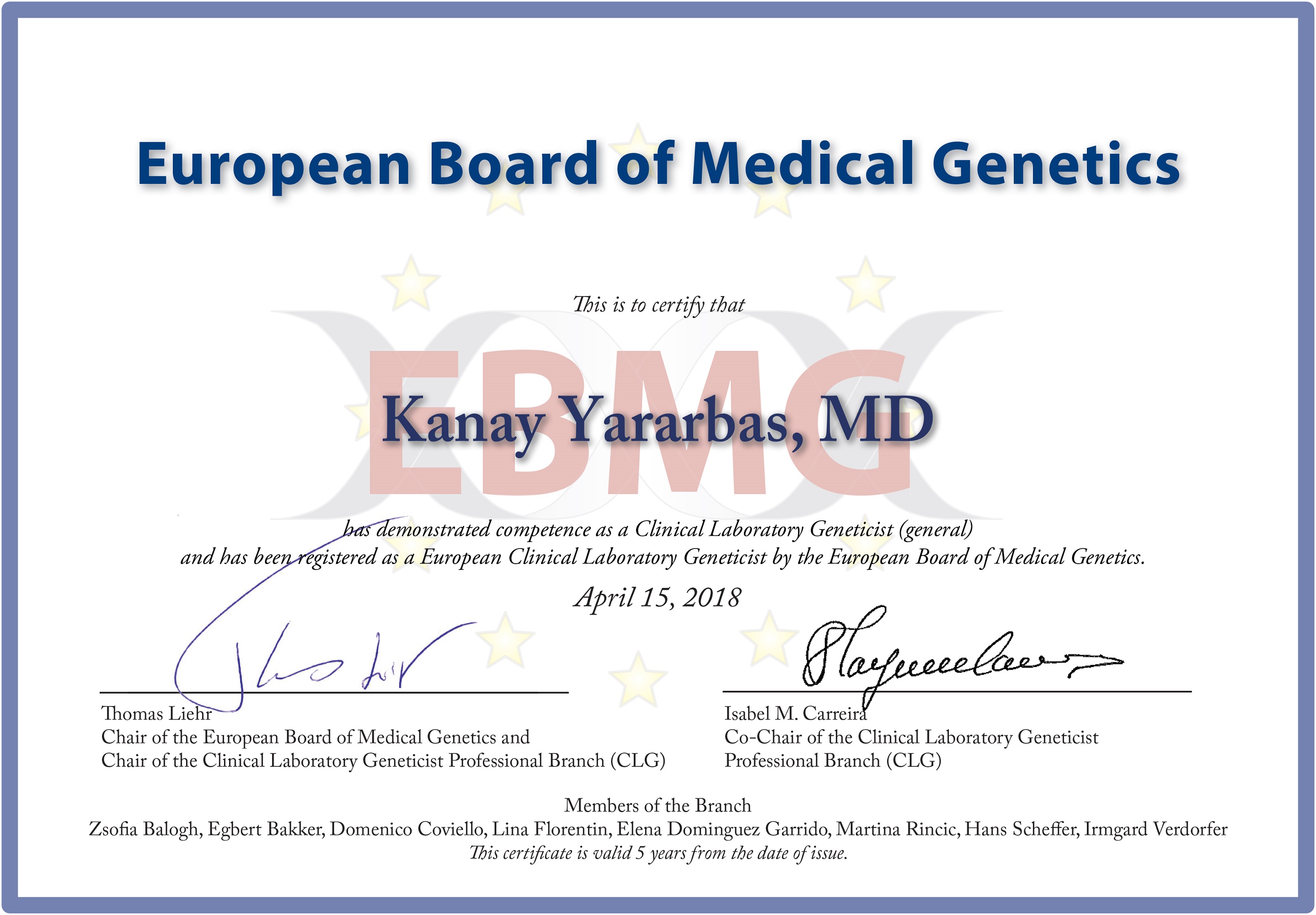 Avrupa Kurul listesine başvuru için en az 8 yıllık genetik tanı tecrübesi ve belli miktarda klinik rapor hazırlamış ve düzenli olarak eğitim almış olmak gerekiyor.Öğretim Üyemizi tebrik ediyor ve başarılarının devamını diliyoruz.