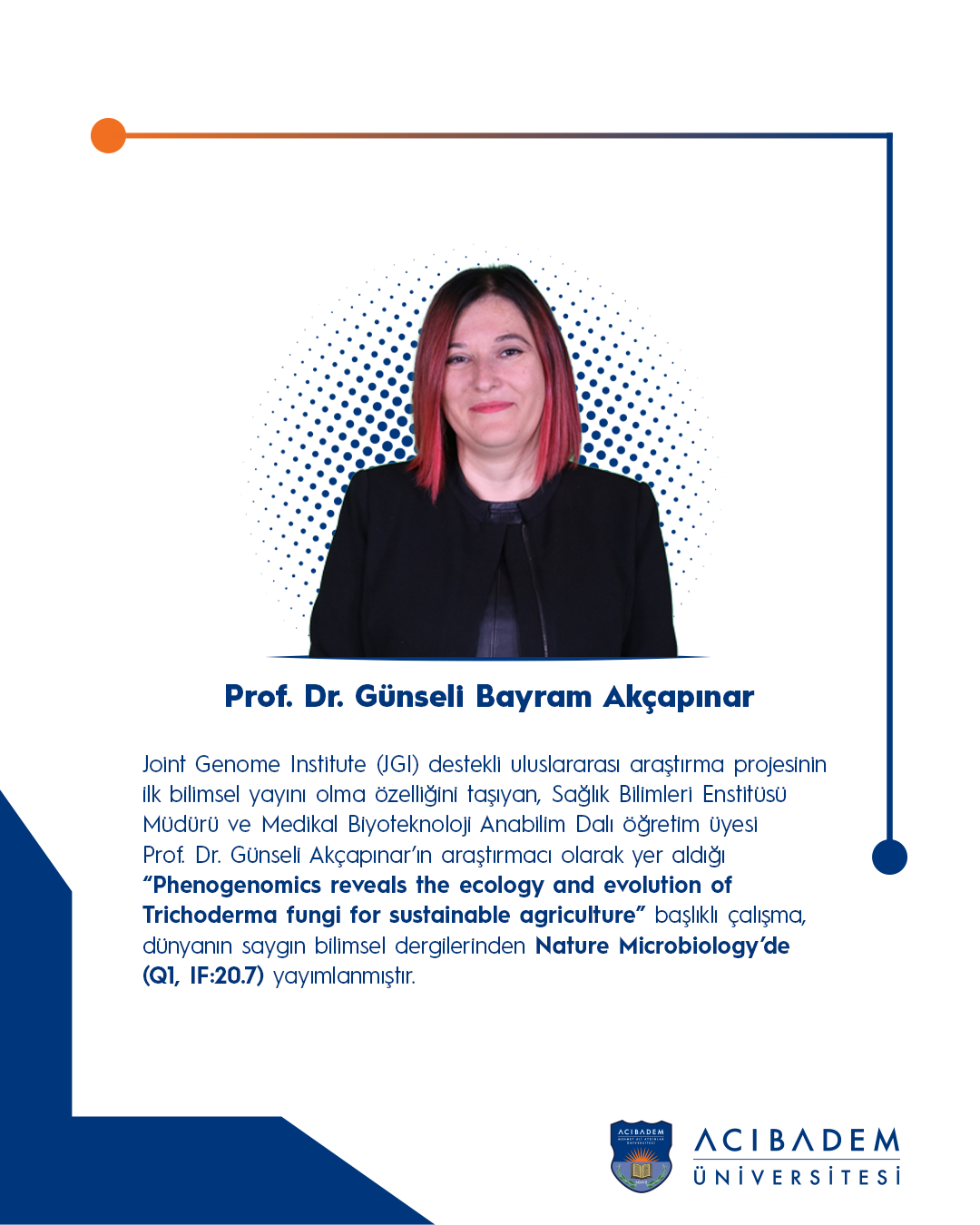 Joint Genome Institute (JGI) destekli uluslararası araştırma projesinin ilk bilimsel yayını olma özelliğini taşıyan, Sağlık Bilimleri Enstitüsü Müdürü ve Medikal Biyoteknoloji Anabilim Dalı öğretim üyesi Prof. Dr. Günseli Akcapinar’ın araştırmacı olarak yer aldığı “Phenogenomics reveals the ecology and evolution of Trichoderma fungi for sustainable agriculture” başlıklı çalışma, dünyanın saygın bilimsel dergilerinden Nature Microbiology’de (Q1, IF:20.7) yayımlanmıştır.